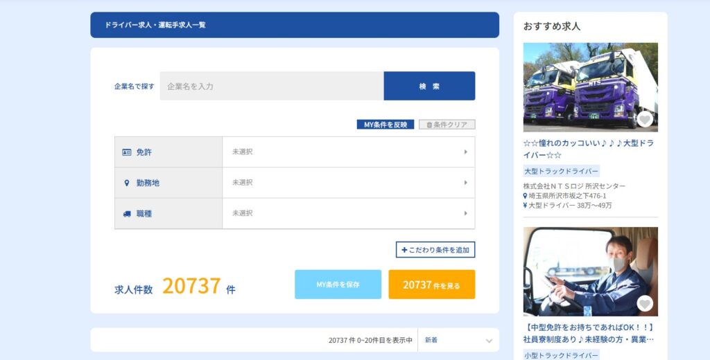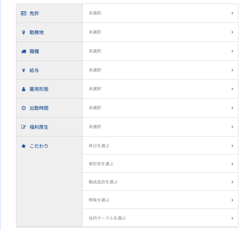 免許・勤務地・職種といった、自分の希望を選択して、検索をして探せます
