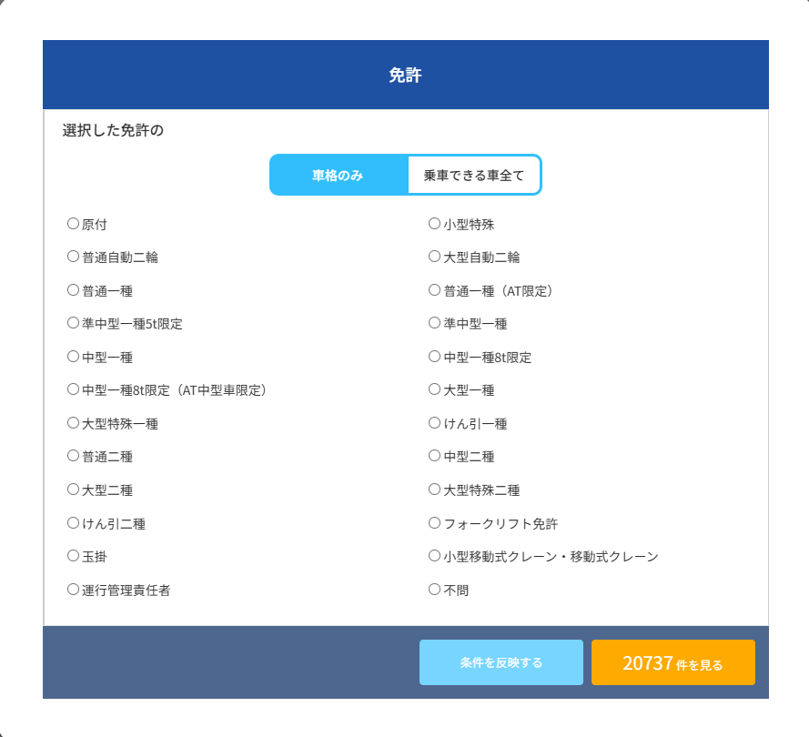 免許では、自分が保有している・これから保有する予定の免許で募集されている求人を検索できます